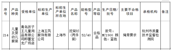 标称上海玉凤服饰有限公司生产、青岛孩子王儿童用品有限公司即墨宝龙广场店销售的挖背衫(两件装)不合格,规格型号52/40,批号:款号:MC1900 颜色:蓝色,不合格项目为绳带要求,承检机构杭州市质量技术监督检测院。