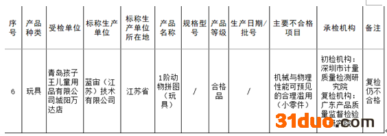 标称蓝宙(江苏)技术有限公司生产、青岛孩子王儿童用品有限公司城阳万达店销售的1阶动物拼图(玩具)不合格,不合格项目为机械与物理性能可预见的合理滥用(小零件),初检机构为深圳市计量质量检测研究院,复检机构为广东产品质量监督检验研究院。备注显示,该产品复检仍不合格。
