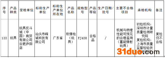标称汕头市峰诚科技有限公司生产、玩具反斗城(中国)商贸有限公司合肥庐阳店销售的软弹枪(玩具)不合格,规格型号FJ438,不合格项目为机械与物理性能可预见的合理滥用(蓄能弹射玩具),初检机构为深圳市计量质量检测研究院,复检机构为上海市质量监督检验技术研究院。备注显示,复检仍不合格。