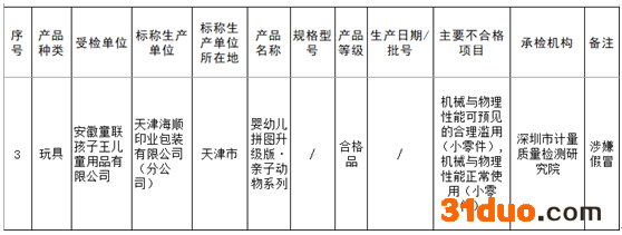标称天津海顺印业包装有限公司(分公司)生产、安徽童联孩子王儿童用品有限公司销售的婴幼儿拼图升级版?亲子动物系列不合格,不合格项目为机械与物理性能可预见的合理滥用(小零件),机械与物理性能正常使用(小零件),承检机构深圳市计量质量检测研究院。备注显示,该产品涉嫌假冒。