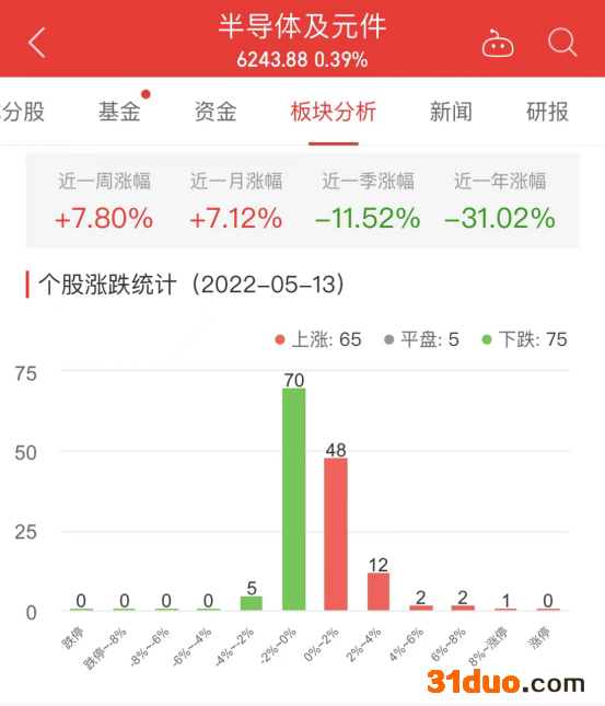 中国经济网北京5月13日讯 今日,半导体及元件板块整体涨幅0.39%,其中65只股票上涨,5只股票平盘,75只股票下跌。
