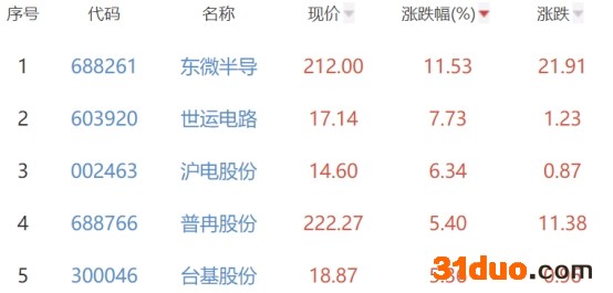 其中,东微半导、世运电路、沪电股份、普冉股份和台基股份位列板块涨幅榜前五位,涨幅分别为11.53%、7.73%、6.34%、5.40%和5.36%。