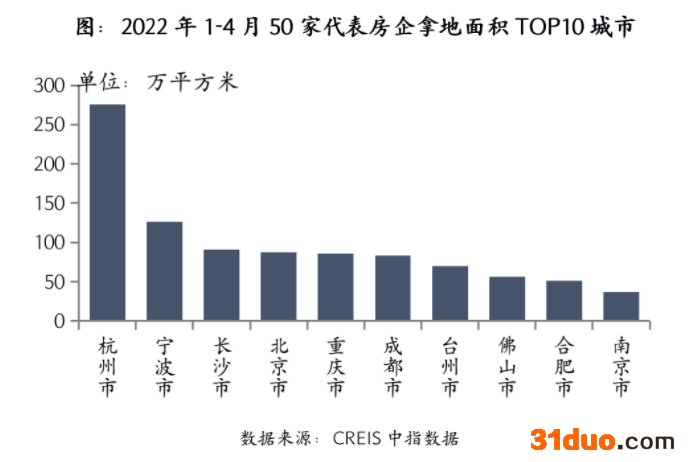 从具体城市上看,杭州、宁波和长沙位列代表房企拿地面积前3城市。