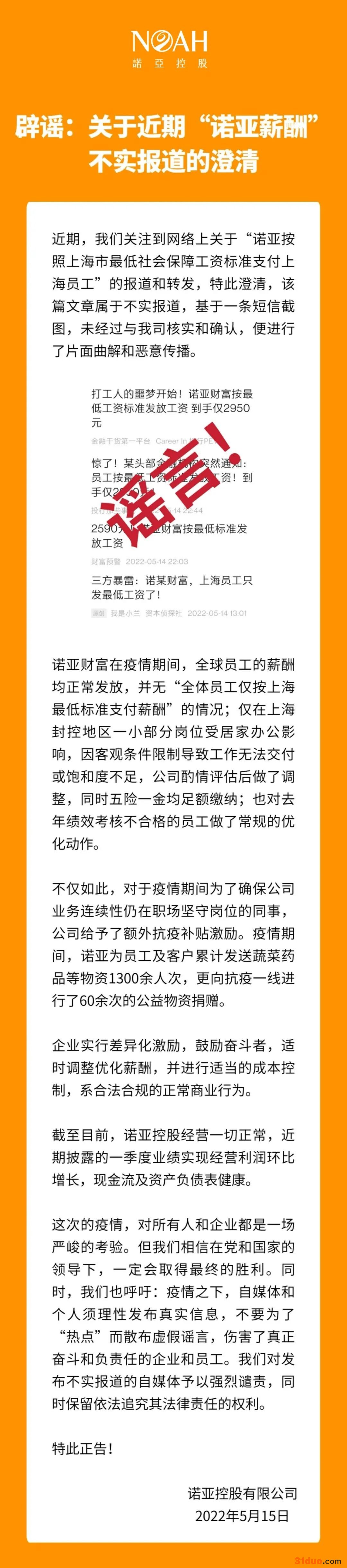 诺亚财富表示,近期,公司关注到网络上关于“诺亚按照上海市最低社会保障工资标准支付上海员工”的报道和转发,特此澄清,该篇文章属于不实报道,基于一条短信截图,未经过与公司核实和确认,便进行了片面曲解和恶意传播。