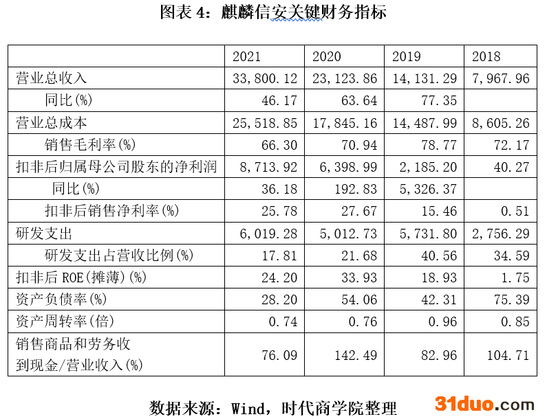 与资产周转能力相关的流动比率、速动比率、资产负债率等财务指标显示,2021年,麒麟信安的负债水平较低,财务风险与同行业上市公司相比处于较低水平。