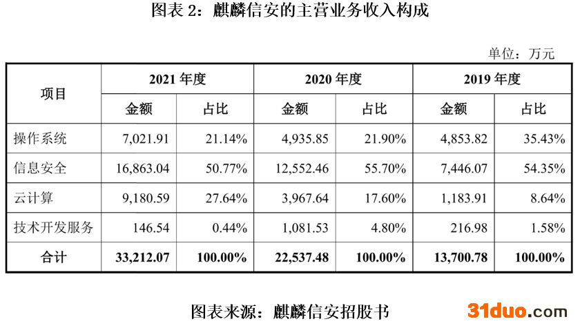 招股书显示,麒麟信安主要从事操作系统产品研发及技术服务,并以操作系统为根基发展信息安全、云计算等业务。2021年,该公司操作系统、信息安全、云计算业务收入分别占总营收21.14%、50.77%、27.64%。