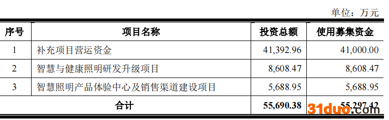 金照明原拟在深交所主板公开发行股票不超过2338.22万股,占发行后总股本的比例不低于25%,拟募集资金5.53亿元,其中4.10亿元用于补充项目营运资金,8608.47万元用于智慧与健康照明研发升级项目,5688.95万元用于智慧照明产品体验中心及销售渠道建设项目。