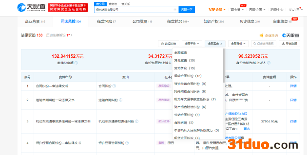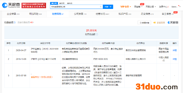 风险信息显示,该公司存在上百条法律诉讼信息,其中包括运输合同纠纷、网络购物合同纠纷、财产损害赔偿纠纷等。此外,该公司还曾因帮助其他经营者进行虚假或者引人误解的商业宣传、违反票据管理规定、违反加盟管理规定等被行政处罚。