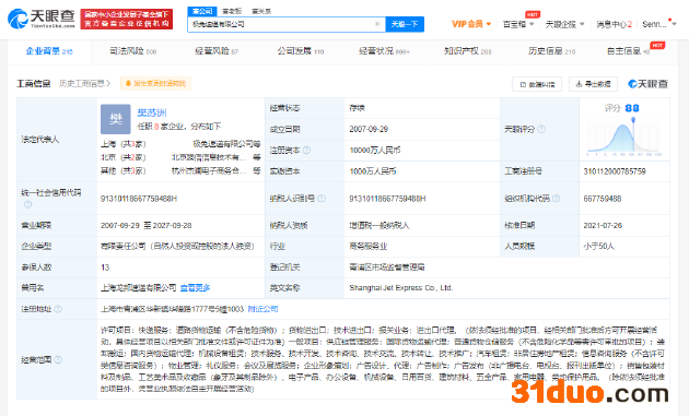 天眼查App显示,涉事公司极兔速递有限公司成立于2007年9月,注册资本1亿人民币,法定代表人为樊苏洲,经营范围包括快递服务;道路货物运输(不含危险货物)等。