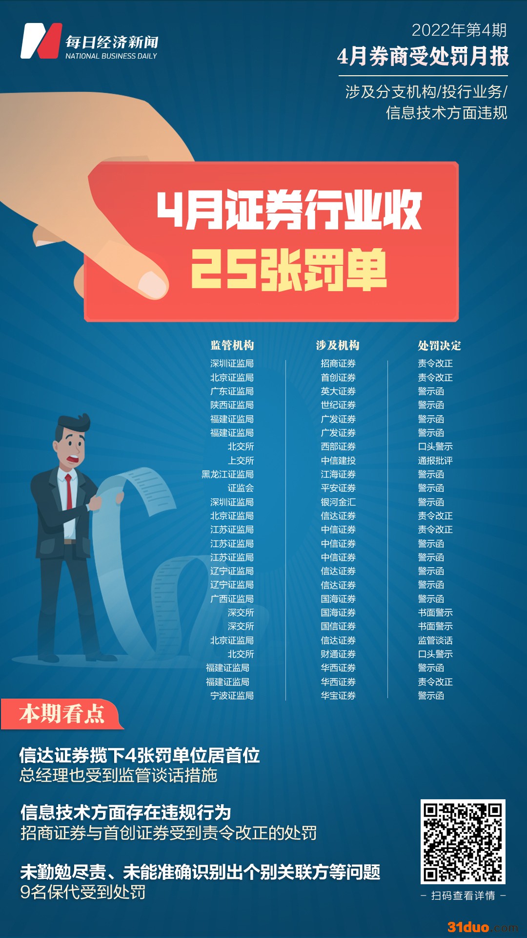 据《每日经济新闻》记者对证监会、各地证监局、交易所等信息梳理,以落款日期计算,4月证券行业共收到25张罚单,涉及17家券商,其中信达证券以涉及4张位居首位,其次是中信证券,涉及3张。另外,广发证券、国海证券、华西证券各涉及2张。若大致归类,涉及分支机构罚单12张,涉及投行业务罚单11张,其余2张涉及信息技术方面。