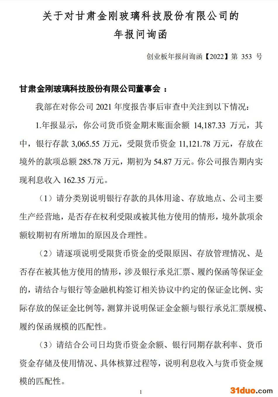 对此,深交所要求金刚玻璃分类别说明银行存款的具体用途、存放地点、公司主要生产经营地,是否存在权利受限或被其他方使用的情形,境外款项余额较期初有所增加的原因及合理性。