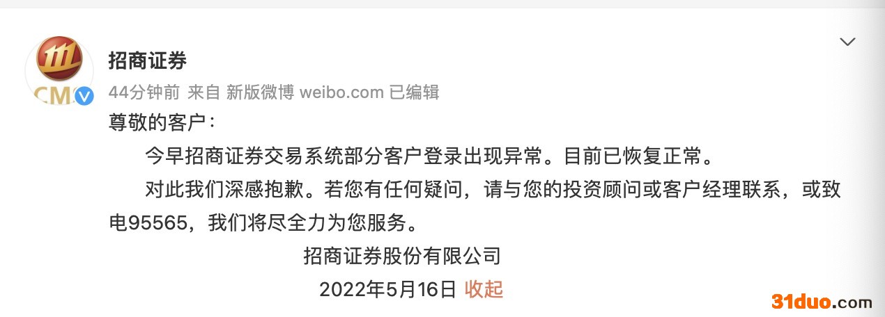 对此,招商证券通过官方微博回应称:今早招商证券交易系统部分客户登录出现异常。目前已恢复正常。对此我们深感抱歉。若您有任何疑问,请与您的投资顾问或客户经理联系,或致电95565,我们将尽全力为您服务。