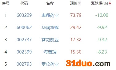 奥翔药业、华润双鹤、葵花药业、海普瑞、罗欣药业位列涨幅榜后五位,涨幅分别为-10.00%、-9.92%、-9.32%、-8.23%、-7.17%。
