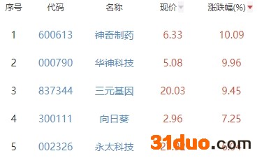 其中,神奇制药、华神科技、三元基因、向日葵、永太科技位列板块涨幅前五位,涨幅分别为10.09%、9.96%、9.45%、7.25%、6.04%。