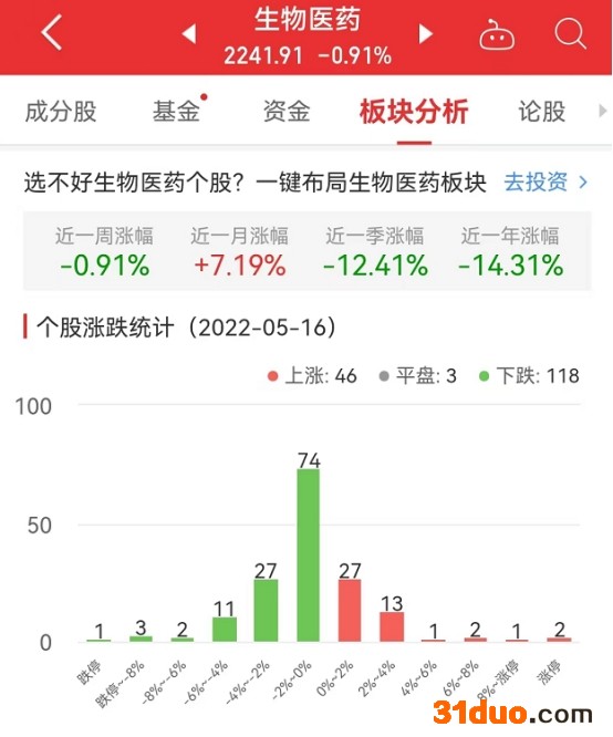 中国经济网北京5月16日讯 今日,生物医药板块整体跌幅0.91%,其中46只股票上涨,3只股票平盘,118只股票下跌。