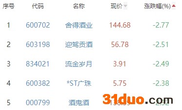 舍得酒业、迎驾贡酒、流金岁月、*ST广珠、酒鬼酒位列涨幅榜后五位,涨幅分别为-2.77%、-2.51%、-2.49%、-2.38%、-2.32%。
