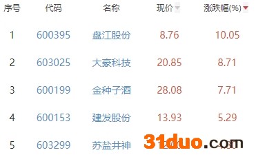 其中,盘江股份、大豪科技、金种子酒、建发股份、苏盐井神位列板块涨幅前五位,涨幅分别为10.05%、8.71%、7.71%、5.29%、4.80%。