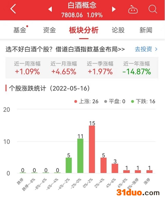 中国经济网北京5月16日讯 今日,白酒概念板块整体涨幅1.09%,其中26只股票上涨,16只股票下跌。