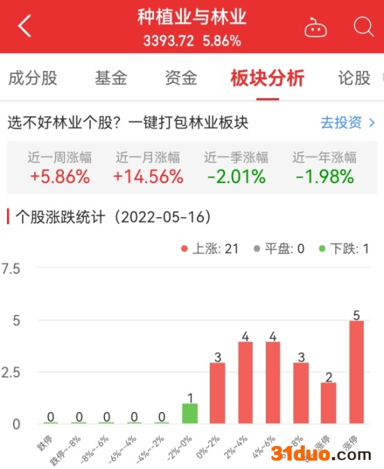 数据显示,截至今日,种植业与林业板块近一周涨幅5.86%,近一月涨幅14.56%,近一季涨幅-2.01%。