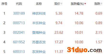 其中,神农科技、丰乐种业、登海种业、苏垦农发、农发种业位列板块涨幅前五位,涨幅分别为14.78%、10.06%、10.01%、10.00%、9.96%。