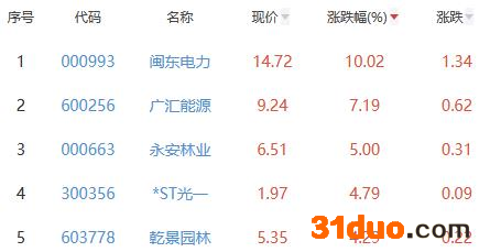 其中,闽东电力、广汇能源、永安林业、*ST光一、乾景园林位列板块涨幅前五位,涨幅分别为10.02%、7.19%、5.00%、4.79%、4.29%。
