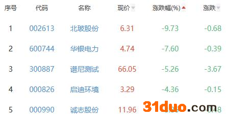 北玻股份、华银电力、谱尼测试、启迪环境、诚志股份位列涨幅榜后五位,涨幅分别为-9.73%、-7.60%、5.26%、-4.36%、-3.86%。