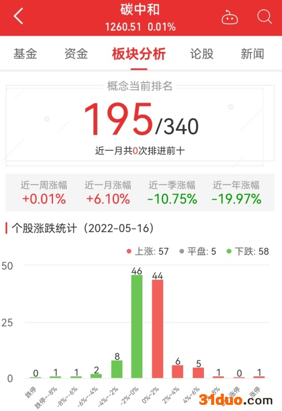 中国经济网北京5月16日讯 今日,碳中和板块整体涨幅0.01%,其中57只股票上涨,5只股票平盘,58只股票下跌。
