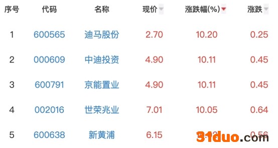 其中,迪马股份、中迪投资、京能置业、世荣兆业和新黄浦位列板块涨幅榜前五位,涨幅分别为10.20%、10.11%、10.11%、10.05%和10.02%。