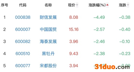 财信发展、中国国贸、海泰发展、黑牡丹和宋都股份位列板块涨幅榜后五位,涨幅分别为-4.49%、-2.57%、-2.46%、-2.38%和-2.23%。