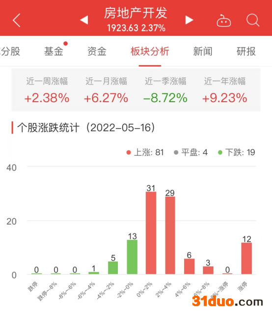 中国经济网北京5月16日讯 今日,房地产开发板块整体涨幅2.37%,其中81只股票上涨,4只股票平盘,19只股票下跌。