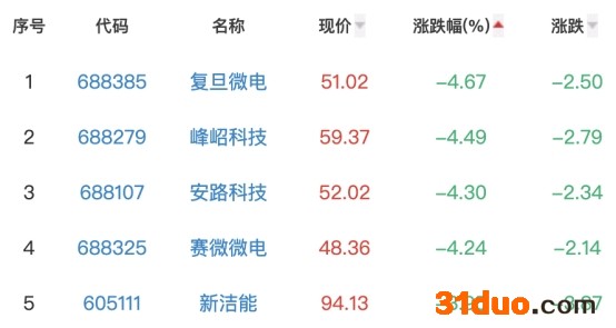 复旦微电、峰岹科技、安路科技、赛微微电、新洁能位列板块涨幅榜后五位,涨幅分别为-4.67%、-4.49%、-4.30%、-4.24%和-3.95%。