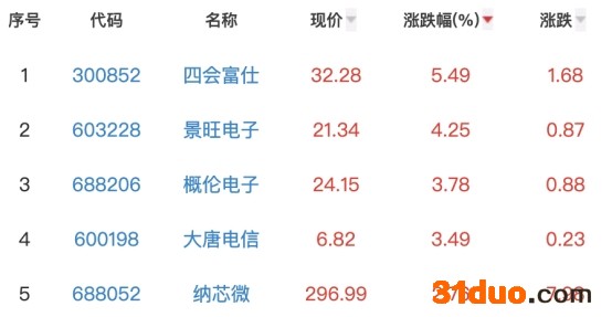 其中,四会富仕、景旺电子、概伦电子、大唐电信和纳芯微位列板块涨幅榜前五位,涨幅分别为5.49%、4.25%、3.78%、3.49%和2.76%。