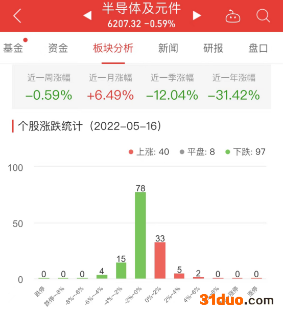 中国经济网北京5月16日讯 今日,半导体及元件板块整体跌幅0.59%,其中40只股票上涨,8只股票平盘,97只股票下跌。