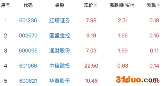 其中,红塔证券、国盛金控、湘财股份、中信建投、华鑫股份位列板块涨幅榜前五位,涨幅分别为2.31%、1.66%、1.59%、0.63%和0.48%。