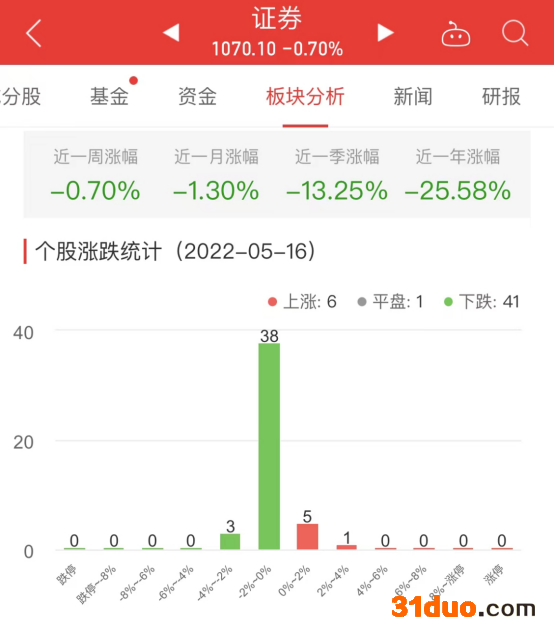 中国经济网北京5月16日讯 今日,证券板块整体跌幅0.70%,其中6只股票上涨,1只股票平盘,41只股票下跌。