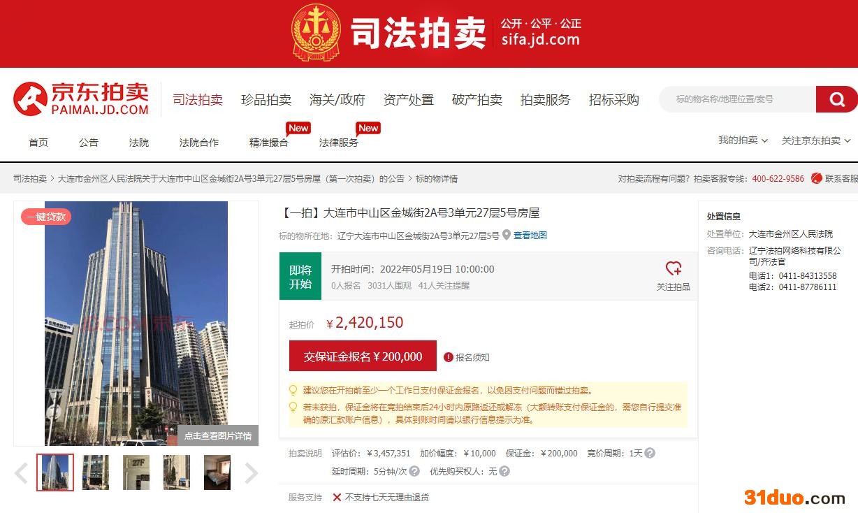 低于市场价起拍的法拍房逐渐成为置业一族关注的重点。位于北京市朝阳区双桥东路的三层别墅,超过400平米起拍价仅为1843万,远低于2620万的评估总价;大连市中山区金城街的一套精装修住宅式公寓,户型优越、视野绝佳,起拍价为242万;还有成都市成华区的大平层住宅,毛坯交付为新居留下无限想象空间,黄金楼层起拍价仅为428万。