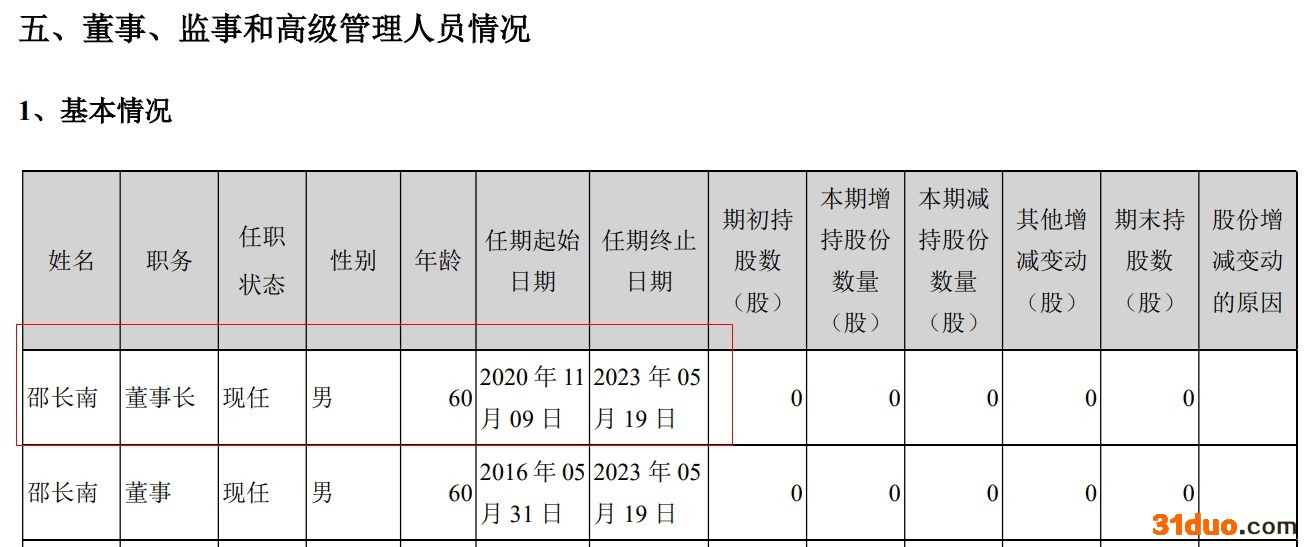 公告称,邵长南因年龄原因,向公司董事会申请辞去公司董事、董事长职务,同时相应辞去董事会战略委员会主任委员和提名委员会委员职务,辞职后邵长南将不再担任公司任何职务。