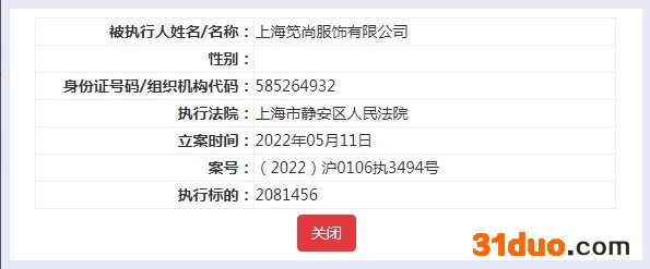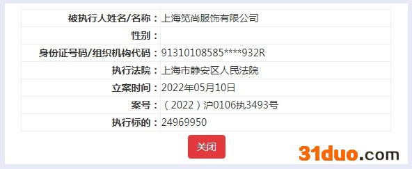 中新经纬5月16日电 中国执行信息公开网信息显示,上海笕尚服饰有限公司(下称“笕尚”或“MJstyle”)新增两则被执行人信息,累计被执行标的2705.14万。