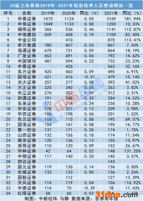 除了砸真金白银来加速数字化转型,人才也是券商们发力所在。中新经纬翻阅41家上市券商近三年年报对信息技术人员的变动情况进行了统计,除7家券商未单独披露外,34家上市券商的数据基本都可以表明:证券业的信息技术岗近三年都处在“招兵买马”状态。