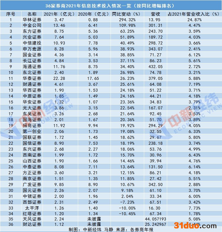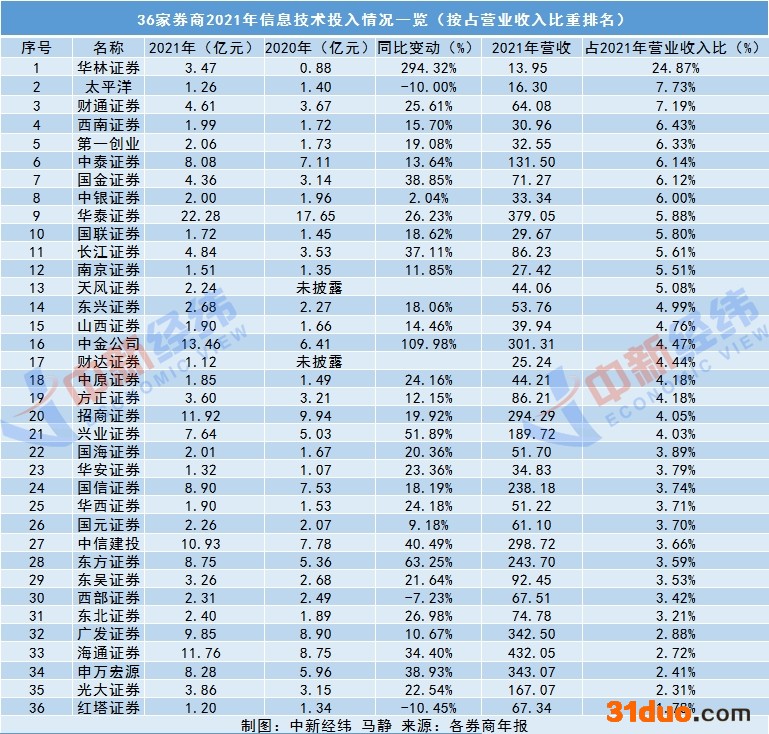 一口气撤销8家分支机构背后也透露出中小券商正在向金融科技转型“狂飙突进”。以信息技术投入占2021年营收比重排名计,会发现以华林证券为代表的中小券商们更不吝于拿出更多的钱加码信息技术。统计数据显示,排名前20的榜单中,除华泰证券、中金公司、招商证券、中泰证券等4家营收规模破百亿元的券商外,其余均为中小券商,2021年信息技术投入占总营收的比重均在4%以上,包括华林证券、太平洋证券、财通证券、西南证券、第一创业、国金证券、中银证券、国联证券、长江证券、南京证券、天风证券、东兴证券、山西证券、财达证券、中原证券、方正证券等16家。