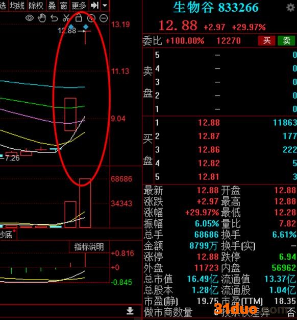 值得注意的是,今日生物谷已经是第二次上演“30cm”涨停,昨日生物谷也拉出了30cm的大长腿,已经是连续两个交易日“30cm”涨停,近两个交易日,生物谷累计涨幅达68.81%。