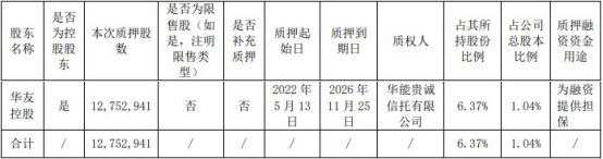 中国经济网北京5月17日讯 昨日晚间,华友钴业(603799.SH)发布公告称,近日,公司收到控股股东浙江华友控股集团有限公司(以下简称“华友控股”)的通知,华友控股办理了股份质押业务。华友控股本次质押股数为1275.29万股,占其所持股份比例6.37%,占公司总股本比例1.04%,质押起始日为2022年5月13日,质押到期日为2026年11月25日,质权人为华能贵诚信托有限公司。
