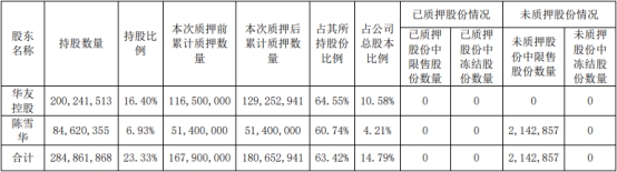 截至公告日,华友控股持有公司股份2.00亿股,占公司总股本的16.40%;其中已累计质押1.29亿股,占其所持公司股份总数的64.55%,占公司总股本的10.58%;华友控股及一致行动人陈雪华共计持有公司股份2.85亿股,占公司总股本的23.33%;其中已累计质押1.81亿股,占其所持公司股份总数的63.42%,占公司总股本的14.79%。