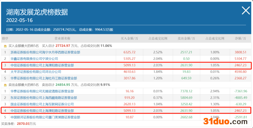 背后是那些资金在疯狂涌入呢?湖南发展今日公布的一日榜数据显示,龙虎榜资金净买入2870万元。知名游资中信证券上海溧阳路“做T”,买入5099万元并卖出2631万元,位列买三和卖四席位。