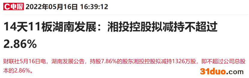 财联社5月16日讯(编辑 刘旭日),大基建牛股、最近十四个交易日录得十一个涨停的湖南发展盘后发布一则利空公告,持有公司股份7.86%的股东湘投控股拟减持1326万股,即不超过公司总股本的2.86%。