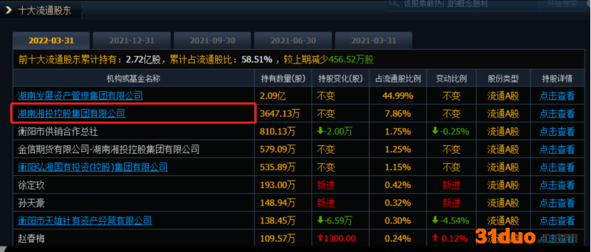 湖南发展一季报显示,湘投控股位列前十大流通股东第二位。