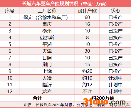 根据长城汽车去年6月发布的“2025战略”规划,长城汽车将在2025年实现全球年销400万辆、营业收入超6000亿元的目标。其中,80%将是新能源汽车,未来五年研发投入将达到1000亿元。但长城汽车2021年财报显示,长城汽车现有产能分别位于保定、重庆、泰州、俄罗斯、平湖、天津和日照,设计产能为144万辆,实际产能为130.48万辆,产能利用率已经高达90.61%,且总产能远不及规划的目标设定。