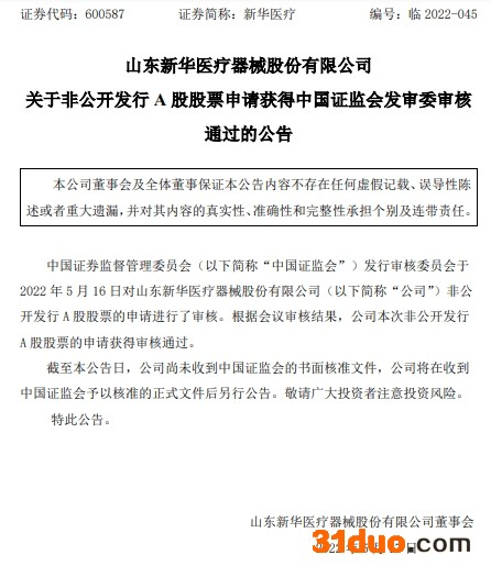 中国经济网北京5月17日讯 新华医疗(600587.SH)昨日晚间发布公告,公司非公开发行A股股票申请获得中国证监会发审委审核通过。