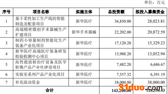 新华医疗本次发行募集资金总额不超过12.84亿元,该等募集资金在扣除发行费用后计划用于下列项目:1.基于柔性加工生产线的智能制造及配套项目,项目投资总额36,850.00万元,拟使用募集资金28,023.81万元;2.高端精密微创手术器械生产扩建项目,项目投资总额22,202.00万元,拟使用募集资金20,872.5万元;3.制药小容量制剂智能化生产装备产业化项目,项目投资总额17,120.28万元,拟使用募集资金15,329.23万元;4.新华医疗高端医疗装备研发检验检测中心项目,项目投资总额13,988.20万元,拟使用募集资金13,052.94万元;5.高性能放射治疗设备及医学影像产品产业化建设项目,项目投资总额7,482.20万元,拟使用募集资金6,686.67万元;6.实验室系列产品产业化项目,项目投资总额7,557.32万元,拟使用募集资金6,391.19万元;7.补充流动资金,项目投资总额38,000.00万元,拟使用募集资金38,000.00万元。