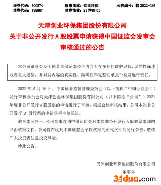 中国经济网北京5月17日讯 创业环保(600874.SH)昨日晚间发布公告,公司非公开发行股票申请获得中国证监会发审委审核通过。